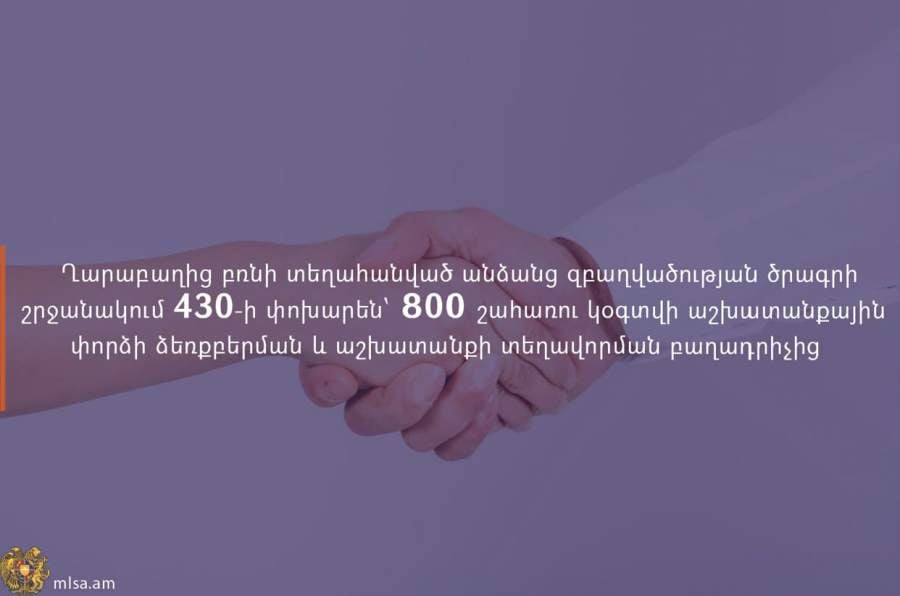 Ղարաբաղից բռնի տեղահանված անձանց զբաղվածության ապահովման ծրագրի շրջանակում նախկին 430-ի փոխարեն 800 շահառու հնարավորություն կունենա օգտվել աշխատանքային փորձի ձեռքբերման և աշխատանքի տեղավորման բաղադրիչից։ Կառավարության այսօրվա նիստում Աշխատանքի և սոցիալական հարցերի նախարարության կողմից ներկայացված նախագիծը հավանության է արժանացել։