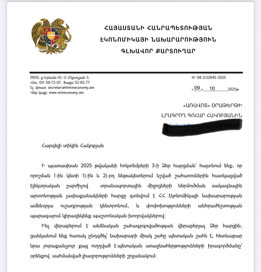 Аravot.am-ին ԿԳՄՍ նախարարությունից գրավոր պատասխանել են, որ էլեկտրային շարժիչով տրանսպորտային միջոցների ներմուծման սակագնային արտոնության չափաքանակների հարցը գտնվում է էկոնոմիկայի նախարարության ամենօրյա ուշադրության կենտրոնում, եւ փոփոխությունների անհրաժեշտության պարագայում կիրազեկեն պաշտոնական խողովակներով: