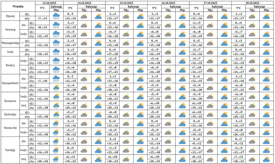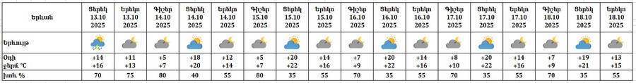 Հոկտեմբերի 13-ի ցերեկը շրջանների մեծ մասում սպասվում է անձրև, առանձին հատվածներում հնարավոր է ամպրոպ։ Հոկտեմբերի 14-18-ին սպասվում է առանց տեղումների եղանակ։