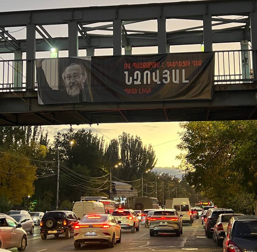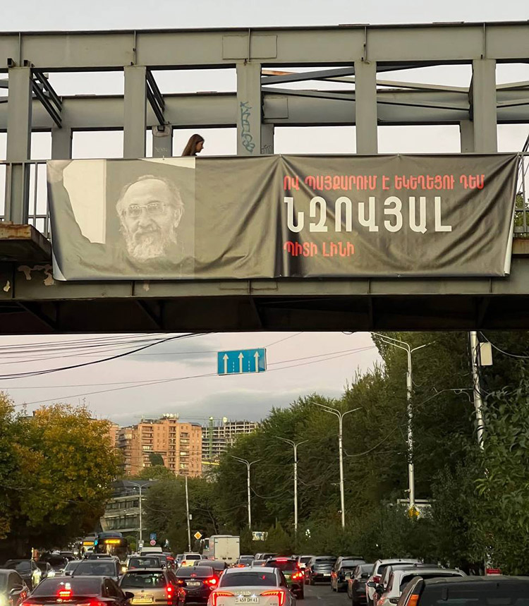 ՀՅԴ «Նիկոլ Աղբալյան» ուսանողական միության անդամները Միքայել արքեպիսկոպոս Աջապահյանի լուսանկարով և այս գրությամբ պաստառներ են փակցրել Երևանի վերգետնյա անցումներից մեկից: