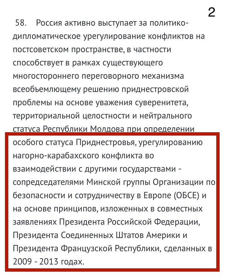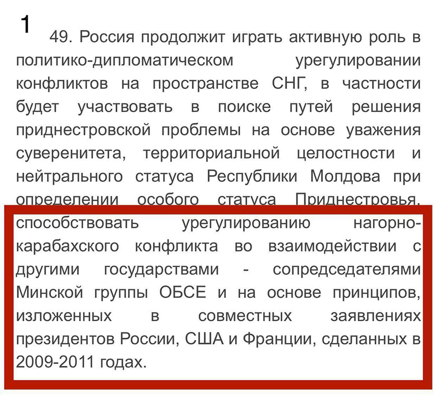 - 2013 թվականի ՌԴ արտաքին քաղաքականության հայեցակարգում ԼՂ հակամարտության կարգավորման վերաբերյալ կար առանձին դրույթ, որով ամրագրվում էր ոչ միայն ԵԱՀԿ Մինսկի խմբի համանախագահների ձևաչափի կարևորությունը, այլև այն սկզբունքները, /այդ թվում ազգերի ինքնորոշման սկզբունքը/որոնք արծարծված էին համանախագահ երկրների ղեկավարների հայտարարություններում 2009-2011 թթ.: