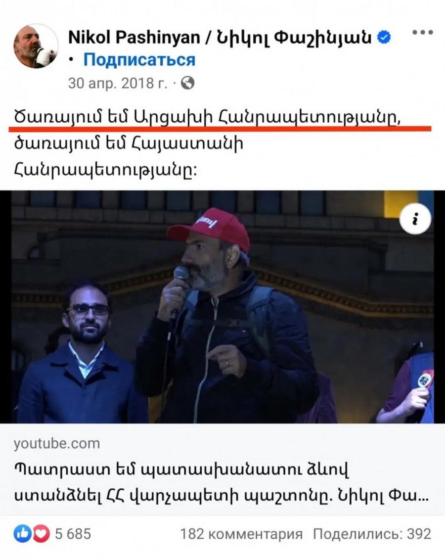 «Ինչո՞ւ ՀՀ նախկին ղեկավարները կյանքի չեն կոչել Ղարաբաղի հարցի՝ իրենց կողմից նկարագրվող հոյակապ լուծումները», հարցնում է Նիկոլ Փաշինյանն ու ինքն էլ պատասխանի երկու տարբերակ առաջարկում․ «Առաջին տարբերակ՝ ցուցաբերել են հանցավոր անգործություն, գուցե ծառայելով օտար երկրների շահերին, երկրորդ տարբերակ՝ հոյակապ լուծումները պարզապես քաղաքական խաբեություն են, և դրանց իրագործումը երբեք էլ հնարավոր չի եղել»։