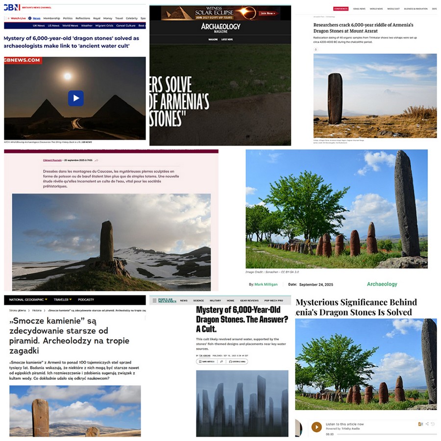Հայկական լեռնաշխարհի 6000 տարվա պատմություն ունեցող վիշապաքարերի վերաբերյալ Հայաստանի գիտնականների բացահայտումների մասին հոդվածը մեծ հետաքրքրություն է առաջացրել միջազգային ասպարեզում: «6000-ամյա «վիշապաքարերի» առեղծվածը լուծվել է՝ հնագետները կապ են հաստատում «ջրի հնագույն պաշտամունքի» հետ», «Հնագիտության ոլորտում մեծ հայտնագործություն․ 6000 տարվա վաղեմության «վիշապաքարերի» առեղծվածը «բացահայտվել է», «Հետազոտողները բացահայտել են Արարատ լեռան մոտ գտնվող Հայաստանի 6000 տարվա հնությամբ վիշապաքարերի գաղտնիքը», ««Վիշապ քարերը» անշուշտ ավելի հին են, քան բուրգերը․ հնագետները բացահայտում են առեղծվածը», «Նոր ուսումնասիրությունը բացահայտում է Հայաստանի հնագույն վիշապաքարերի առեղծվածը», Մեգալիթյան «վիշապաքարերը» հավանաբար եղել են հնագույն ջրի պաշտամունքի մի մասը» վերնագրերով հոդվածներ են հրապարակել G.Britain news channel-ը, Daily Express-ը, The Jerusalem Post prepares-ը, National Geographic-ը, Greek Reporter –ը, Slate-ը, Archaeology News-ը, Archaeology Magazine-ը, Наука-ն, ZAP.aeiou-ն, Nacion-ը, Derstandard-ը, ÇeviriHaber-ը։