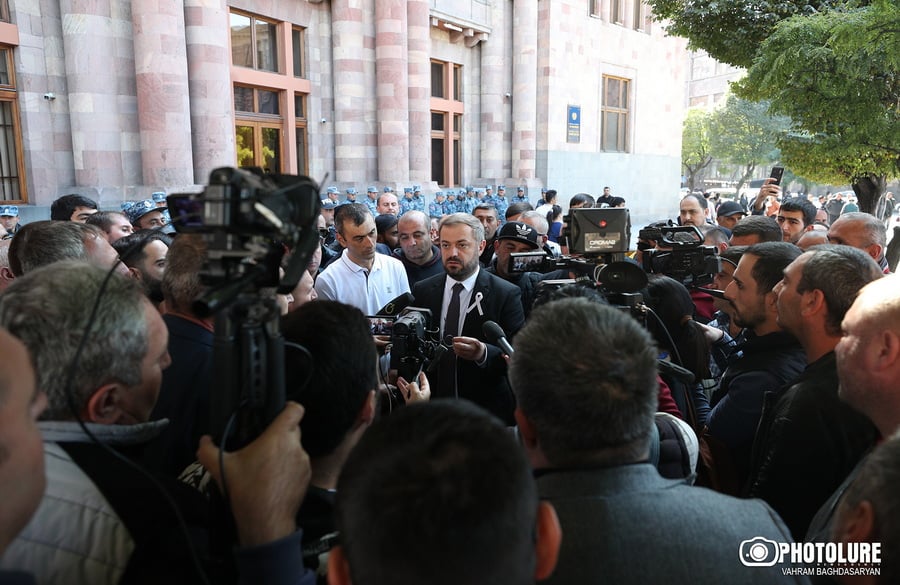 Minister of Economy of Armenia Gevorg Papoyan met with the truck drivers protesting near the government building in Yerevan, Armenia.