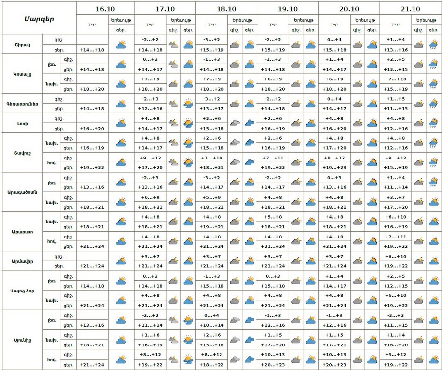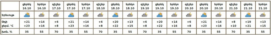 Հոկտեմբերի 16-ի ցերեկը, 17-20-ին, 21-ի գիշերը սպասվում է առանց տեղումների եղանակ։ Հոկտեմբերի 21-ի ցերեկը առանձին շրջաններում սպասվում է կարճատև անձրև։