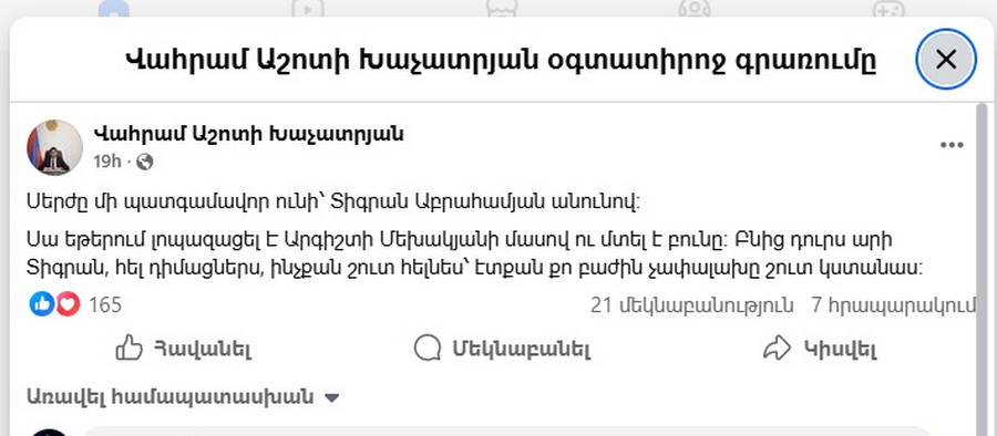 Արմավիրի մարզպետ Վահրամ Խաչատրյանը ֆեյսբուքյան գրառմամբ նշել էր.