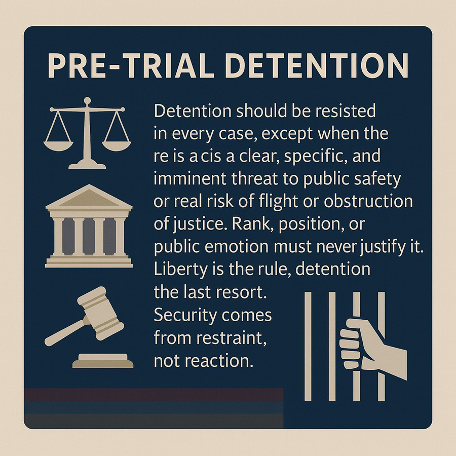 Որևէ կարգավիճակ, պաշտոն կամ հանրային հույզ երբեք չեն կարող արդարացնել կալանքը։ Այն արդարացվում է միայն ապացույցներով՝ իրական, վերստուգելի, անհատականացված ապացույցներով առ այն, որ ո՛չ մի այլ միջոց չէր կարող ավելի արդյունավետ լինել։