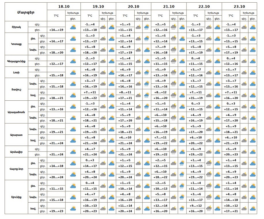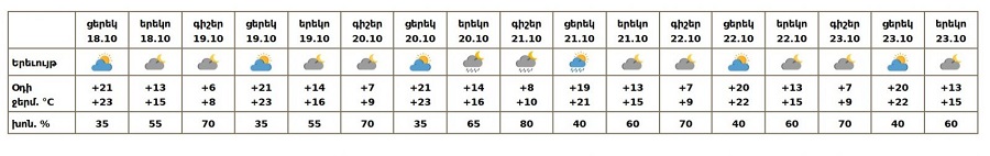 Հոկտեմբերի 18-ի և 22-ի ցերեկը, 19-ին, 23-ին սպասվում է առանց տեղումների եղանակ։ Հոկտեմբերի 20-ի երեկոյան, 21-ին, 22-ի գիշերը առանձին շրջաններում սպասվում է կարճատև անձրև։ Քամին արևմտյան՝ 2-5մ/վ, հոկտեմբերի 20-21-ին առանձին շրջաններում հնարավոր է քամու ուժգնացում՝ 16-19 մ/վ արագությամբ։ Օդի ջերմաստիճանը հոկտեմբերի 20-21-ին գիշերը կբարձրանա 4-5 աստիճանով։