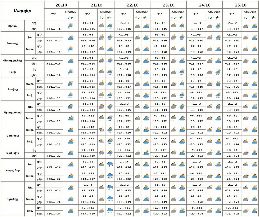 Օդի ջերմաստիճանը հոկտեմբերի 21-ի ցերեկը կնվազի 2-3 աստիճանով, հոկտեմբերի 22-ին ցերեկը նույնքան կբարձրանա։
