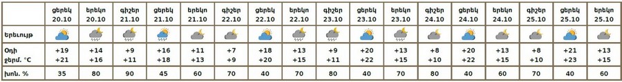 Հոկտեմբերի 20-ի ցերեկը, 21-ին, 22-ի ուշ երեկոյան, 23-24-ին առանձին շրջաններում սպասվում է կարճատև անձրև։ Հոկտեմբերի 25-ին պասվում է առանց տեղումների եղանակ։