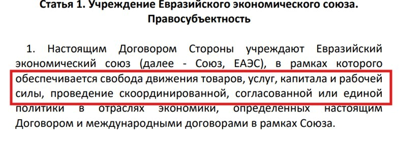 2014 թվականի մայիսի 29-ին ստորագրված ԵԱՏՄ պայմանագրի 1-ին հոդվածը սահմանում է․ «Սույն Պայմանագրով Կողմերը ստեղծում են Եվրասիական տնտեսական միությունը, որի շրջանակներում ապահովվում է ապրանքների, ծառայությունների, կապիտալի և աշխատուժի ազատ տեղաշարժը, ինչպես նաև համակարգված, համաձայնեցված կամ միասնական քաղաքականության իրականացումը տնտեսության այն ոլորտներում, որոնք սահմանված են սույն Պայմանագրով և Միության շրջանակներում կնքվող միջազգային պայմանագրերով»։