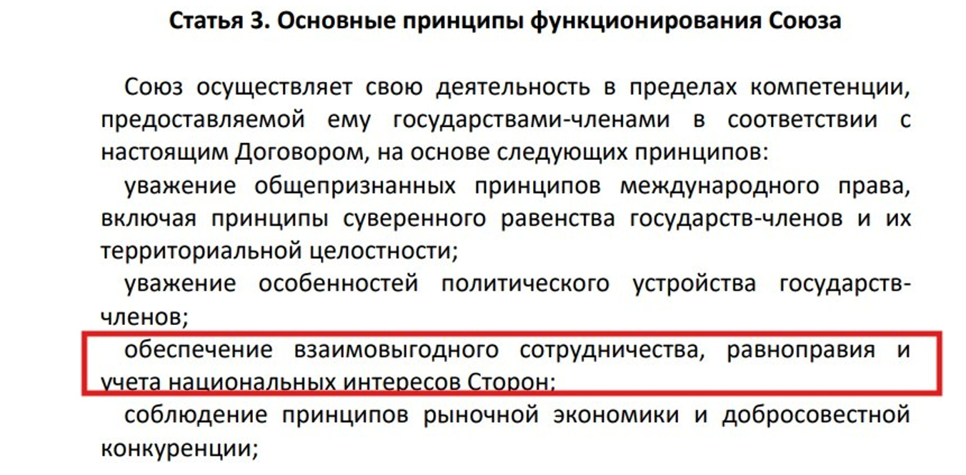 Պայմանագրի 3-րդ հոդվածը հստակեցնում է, որ Միությունը գործում է անդամ պետությունների կողմից իրեն տրված լիազորությունների շրջանակում՝ հիմնվելով մի շարք սկզբունքների վրա, այդ թվում՝ Կողմերի փոխշահավետ համագործակցության, հավասարության և ազգային շահերի հաշվառման սկզբունքի վրա։