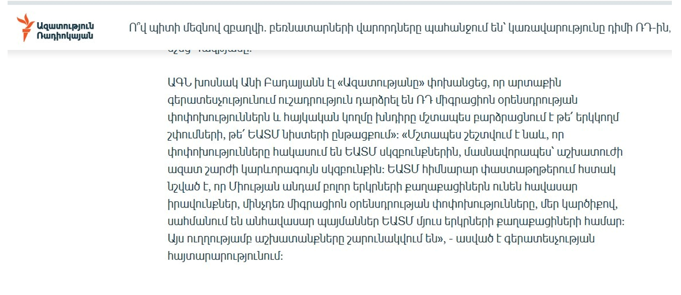 «Ազատություն» ռադիոկայանի տարածած ԱԳՆ հայտարարության մեջ, մասնավորապես, նշվում է․ «Մշտապես շեշտվում է, որ փոփոխությունները հակասում են ԵԱՏՄ սկզբունքներին, մասնավորապես՝ աշխատուժի ազատ շարժի կարևորագույն սկզբունքին։ ԵԱՏՄ հիմնարար փաստաթղթերում հստակ նշված է, որ Միության անդամ բոլոր երկրների քաղաքացիներն ունեն հավասար իրավունքներ, մինչդեռ միգրացիոն օրենսդրության փոփոխությունները, մեր կարծիքով, սահմանում են անհավասար պայմաններ ԵԱՏՄ մյուս երկրների քաղաքացիների համար»։