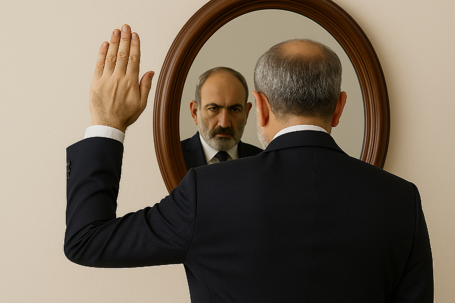 2025 թվականի օգոստոսի 8-ից վարչապետի կողքին մի քանի հոգի ևս կանգնեցին արդեն ավելի մեծ հայելու առաջ ու բարձրացրեցին իրենց ձախ ձեռքն ու սկսեցին համոզել ժողովրդին, որ իրենք իրենց աջ ձեռքն են բարձրացրել և ժողովուրդն էլ է նայում հայելու մեջ ու ասում է, հա էլի էս մարդիկ ճիշտ են ասում, իրենց աջ ձեռքն են բարձրացրել, կու՞յր է այս ընդդիմությունն ու հոգևորականությունը, չե՞ն տեսնում, որ մարդիկ իրենց աջ ձեռքն են բարձրացրել։