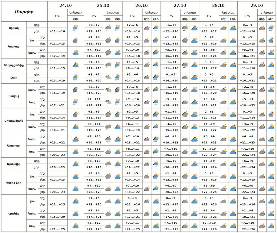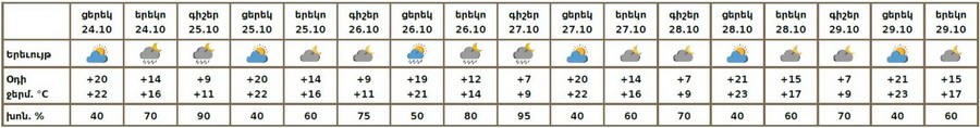 Հոկտեմբերի 24-ի ցերեկը, 25-ին, 26-ի ցերեկը, 27-ի գիշերը, 29-ի ուշ երեկոյան առանձին շրջաններում սպասվում է կարճատև անձրև։ Հոկտեմբերի 26-ի գիշերը, 27-ի ցերեկը, 28-ին սպասվում է առանց տեղումների եղանակ: