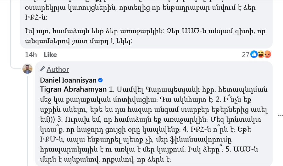 «Իրազեկ քաղաքացիների միավորում» ՀԿ ծրագրերի համակարգող Դանիել Իոաննիսյանը ֆեյսբուքյան իր գրառմանը օգտատերերից մեկի արձագանքին ի պատասխան նշել է, որ բարերար Սամվել Կարապետյանի կալանավորման մեջ կա քաղաքական մոտիվացիա։