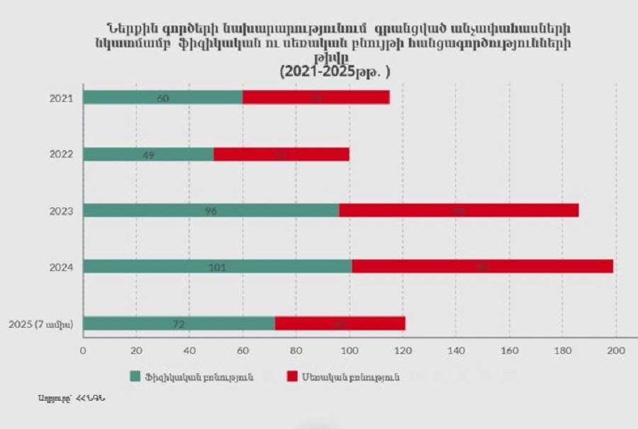 Այս տարվա հունվար-հուլիսի տվյալներով արդեն իսկ սեռական բռնության 49 դեպք է գրանցվել, ֆիզիկական բռնության՝ 72 դեպք։