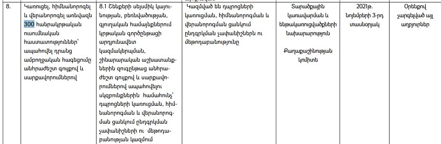 Մինչև 2026 թվականը կառուցել, հիմնանորոգել և վերանորոգել առնվազն 300 հանրակրթական ուսումնական հաստատություններ, դրանք ապահովել անհրաժեշտ գույքով և սարքավորումներով․ սա Հայաստանի Հանրապետության կառավարության խոստումն է, որն ամրագրված է Կառավարության 2021-2026 թվականների գործունեության միջոցառումների ծրագրում։