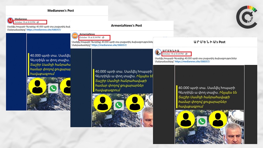Նույն ժամին՝ 13։10-ին, medianews.site-ի հոդվածը կցած ձայնագրության վերաբերյալ գրառում են տարածել ArmeniaNews (արխ․) և «ԱՐՄԵՆԻԱ» (արխ․) ֆեյսբուքյան էջերը։ Ըստ ուսումնասիրության՝ այս էջերն ուղիղ կապ ունեն medianews.site-ի հետ և, ամենայն հավանականությամբ, կառավարվում են նույն տեղից, քանի որ միաժամանակ տարածում են նույն գրառումները։