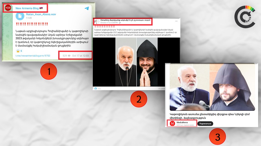 #CivilNetCheck-ի ուսումնասիրությունը ցույց է տալիս, որ ձայնագրությունը ամենաառաջինը հրապարակվել է New Armenia Blog անվանումով տելեգրամյան ալիքում՝ հոկտեմբերի 17-ին, ժամը 12:03-ին: Ալիքն ունի մոտ 3,700 հազար հետևորդ։ Էջում լրատվական նյութերից բացի, պարբերաբար տարածվում են ընդդիմադիր գործիչներին ծաղրող գրառումներ և արհեստական բանականությամբ ստեղծված կեղծ պատկերներ ու դիփֆեյքեր։