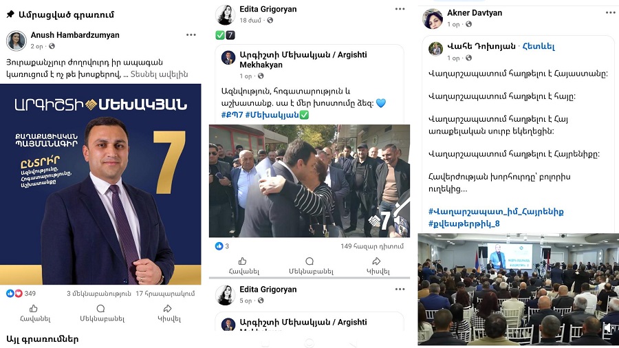 Թիվ 14/44 տեղամասային հանձնաժողովի քարտուղար Էդիտա Գրիգորյանն իր ֆեյսբուքյան էջում ևս ակտիվ քարոզչություն է իրականացնում՝ տարածելով Արգիշտի Մեխակյանի լուսանկարով քարոզչական նյութեր։ Պարզաբանում ստանալու նպատակով նույն սոցիալական հարթակով գրեցինք Է․ Գրիգորյանին։ Նա հետևյալ պատասխանը տվեց․ «իմ անձնական էջով կարող եմ կիսվել այն ամենով, ինչ ինքս եմ ցանկանում, օրենքն ինձ չի արգելում վարել անձնական էջս, այսուհետ ինձ այլևս չանհանգստացնեք»։
