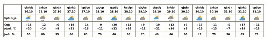 2-5մ/վ: Օդի ջերմաստիճանը հոկտեմբերի 26-ի ցերեկը կնվազի 2-3 աստիճանով, 27-28-ին աստիճանաբար նույնքան կբարձրանա։