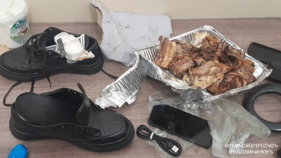 Մասնավորապես՝ կալանավորված անձի մոտ առկա սննդամթերքի տարայում պատրաստված թաքստոցից հայտնաբերվել են բջջային հեռախոս՝ բաժանորդային քարտով, և լիցքավորման լար, իսկ նրա հագին եղած կոշիկների ներբաններից հայտնաբերվել են թմրամիջոցի նմանվող դեղնականաչավուն բուսական զանգված՝ ընդհանուր 27,4 գրամ քաշով, և բյուրեղանման փոշեզանգված՝ 2,3 գրամ քաշով, ինչպես նաև 34 հատ գործարանային արտադրության խաղաթուղթ։