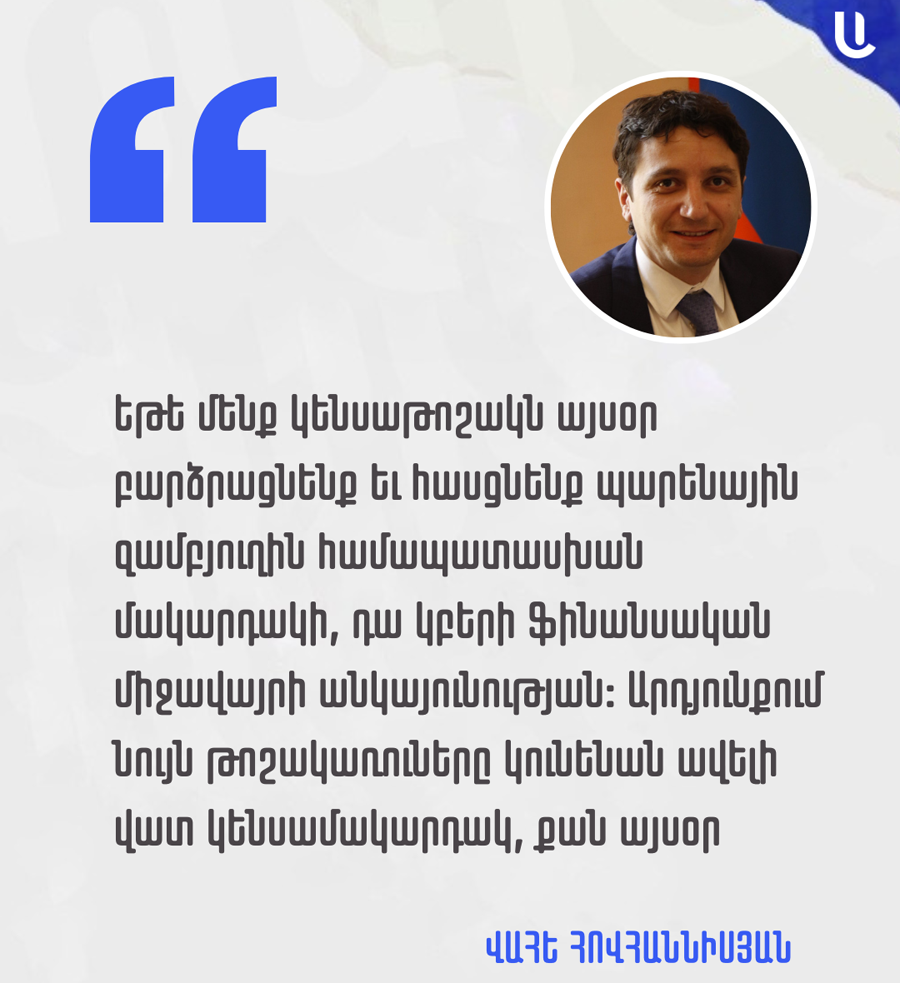 Կառավարության 2021-2026 թթ․ ծրագրի տապալման համար ամբողջ թուքումուրը, փաստորեն, այս օրերին ուտում է ֆինանսների նախարար Վահե Հովհաննիսյանը, որն ԱԺ հանձնաժողովներին է ներկայացնում 2026 թ․ բյուջեն։ Ընդդիմադիրների հարցին, թե ինչպես եղավ, որ 7 տոկոս տնտեսական աճի պայմաններում ո՛չ թոշակն է էապես ավելանում, ո՛չ նվազագույն աշխատավարձը, ու շարունակում ենք երկրում 700 հազար աղքատ ունենալ, նա պատասխանել է. «Եթե մենք կենսաթոշակն այսօր բարձրացնենք եւ հասցնենք պարենային զամբյուղին համապատասխան մակարդակի, դա կբերի ֆինանսական միջավայրի անկայունության։ Արդյունքում նույն թոշակառուները կունենան ավելի վատ կենսամակարդակ, քան այսօր»։