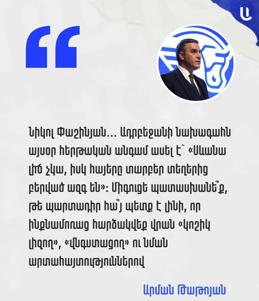 «Միասնության թևեր» քաղաքական նախաձեռնության հիմնադիր ղեկավար, Իրավունքի և արդարության կենտրոն «Թաթոյան» հիմնադրամի տնօրեն, ՀՀ մարդու իրավունքների նախկին պաշտպան Արման Թաթոյանի ֆեյսբուքյան գրառումը