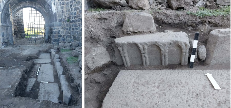 Հատկապես ուշագրավ են պեղումները պարսպի մուտքի մոտ, որտեղ հետախուզական աշխատանքների ընթացքում ի հայտ եկավ միջնադարյան ճանապարհ՝ շարված սալաքարերով, տապանաքարերով, ինչպես նաև այդ ճանապարհի եզրաքարերը, որտեղ նույնպես օգտագործված են մեծ թվով զանազան կոթողների, այդ թվում՝ որմնակամարներով պատվանդանի հետաքրքիր բեկորներ։