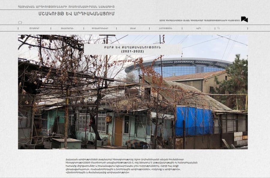 «Մշակույթ և արդիականացում» ծրագրի շրջանակում Ինստիտուտի հնգամյա աշխատանքի արդյունքները նախևառաջ կայքում հրապարակված 20 ծավալուն հետազոտություններն են (ևս հինգը կհրապարակվեն տարեվերջին)։ Այս հետազոտությունների համար առանցքային կարևորություն ունեցող 23 գրավոր աղբյուրներ անցել են բնագրագիտական մշակում, թվայնացվել և հրապարակվել հետազոտողների ծավալուն ներածություններով («ուղենշային տեքստեր»)։ Նույն հետազոտությունների համար արխիվային, հաճախ նորահայտ 247 նյութեր («վավերագրեր») նույնպես անցել են բնագրագիտական մշակում, թվայնացվել և հրապարակվել են հետազոտողների նախաբաններով։