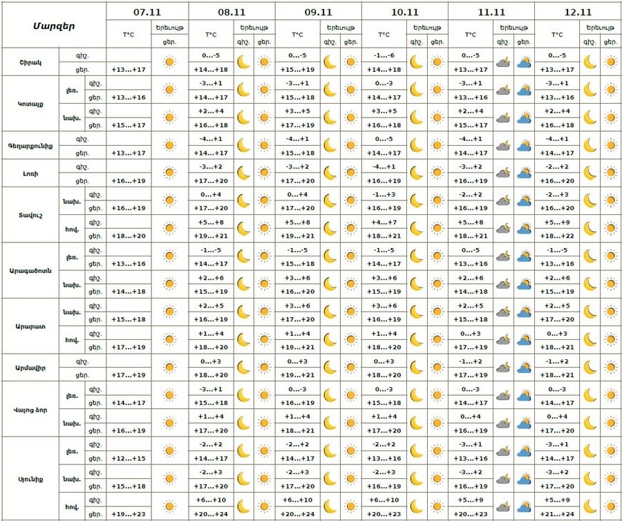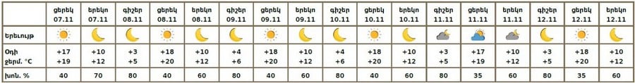 Նոյեմբերի 7-ի ցերեկը, 8-12-ին սպասվում է առանց տեղումների եղանակ: Քամին հարավարևմտյան՝ 2-5մ/վ: Օդի ջերմաստիճանը 8-9-ին ցերեկը աստիճանաբար կբարձրանա ևս 2-3 աստիճանով։