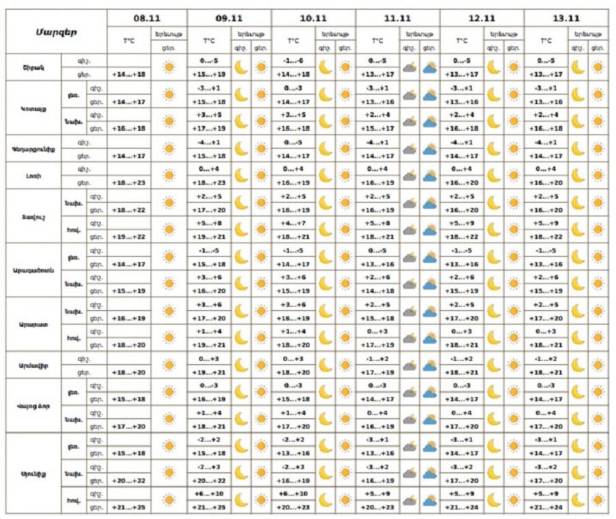 Նոյեմբերի 8-ի ցերեկը, 9-13-ին սպասվում է առանց տեղումների եղանակ։