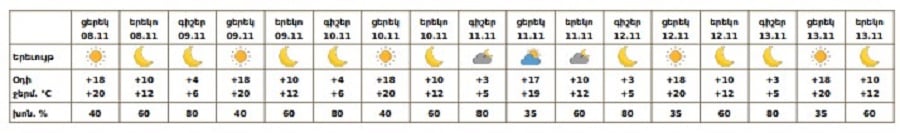 Նոյեմբերի 8-ի ցերեկը, 9-13-ին սպասվում է առանց տեղումների եղանակ: Քամին հարավարևմտյան՝ 2-5մ/վ: Օդի ջերմաստիճանը 8-9-ին ցերեկն աստիճանաբար կբարձրանա ևս 1-2 աստիճանով։