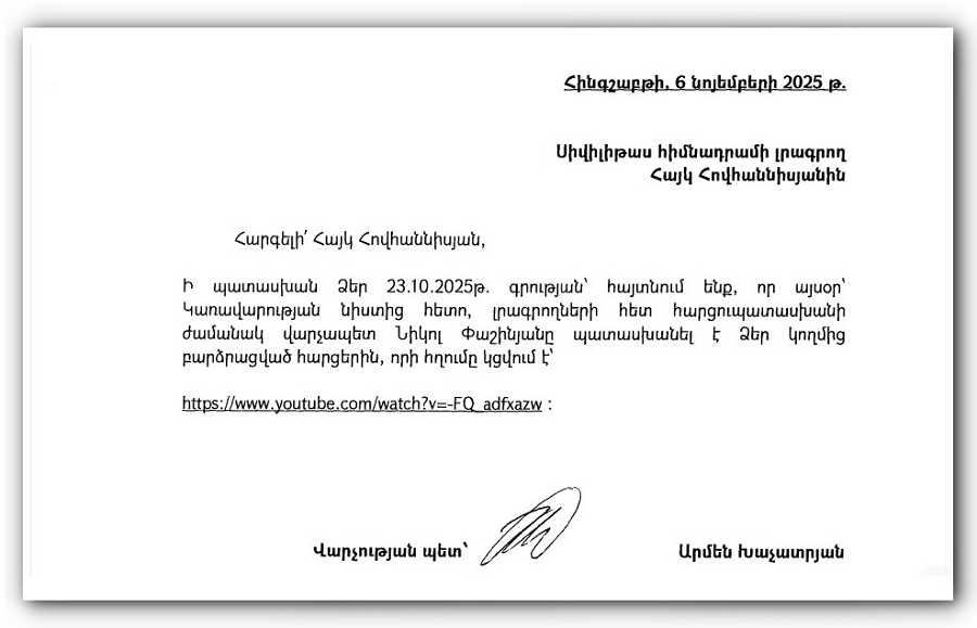 Վարչապետի աշխատակազմը, խախտելով «Տեղեկատվության ազատության մասին» օրենքով սահմանված հնգօրյա ժամկետը, պատասխանել է միայն երկու շաբաթ անց՝ նոյեմբերի 6-ին։ Գրությունում աշխատակազմը խուսափել է պատասխանել հարցերին՝ փոխարենը տեղեկացնելով, որ վարչապետը պատասխանել է դրանց նոյեմբերի 6-ին լրագրողների հետ հարցուպատասխանի ժամանակ։