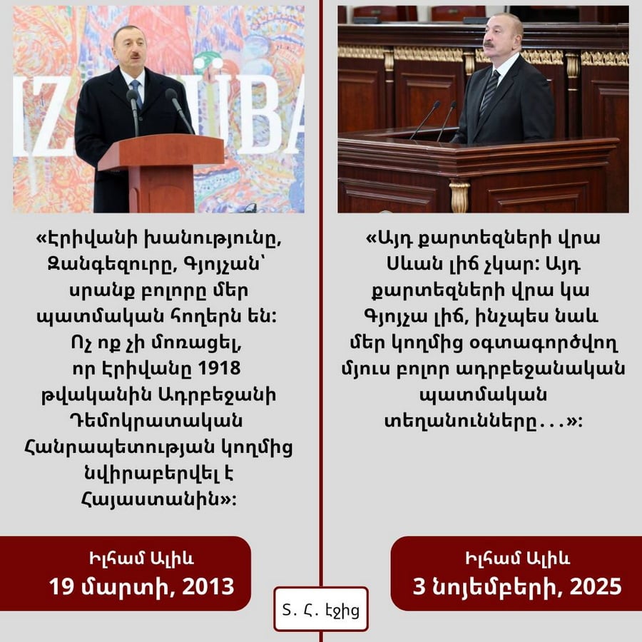 12 տարի Իլհամ Ալիեւը նույն բանն է ասում՝ ասում էր դա, երբ կար հակամարտություն, և ասում է դա, երբ «խաղաղություն» է հաստատվել։ Առաջ ֆոկուսը Արցախի վրա էր, հիմա արդեն հարցը «լուծվեց», հիմա էլի նույն բանն է ասում՝ պարզ ու հստակ։ Ասում է՝ ես աչք ունեմ ձեր երկրի վրա, հայեր ջան, ուզում եմ զավթեմ, ինձնով անեմ։ Հիմա մեզ մոտ էլ դեռ ոմանք շարունակում են «ներքին լսարանի համար է ասում» դատարկ թեզը։ Ալիեւն ասում է իր նպատակների մասին պարզ, որ հասկանանք, որ պետք է դեմն առնել, քանի հնարավոր է՝ դիվանագիտական մեթոդներով, ոչ թե Արցախի օրինակի պես՝ ասածները լուրջ չընդունել ու հետո ունենալ այն, ինչ ունենք։ Արցախի կորուստը խաղաղ կյանք չէր կարող բերել, դա պարզ էր ցանկացած մեկի համար, ով տարրական գիտելիքներ ունի Ադրբեջանից․․․