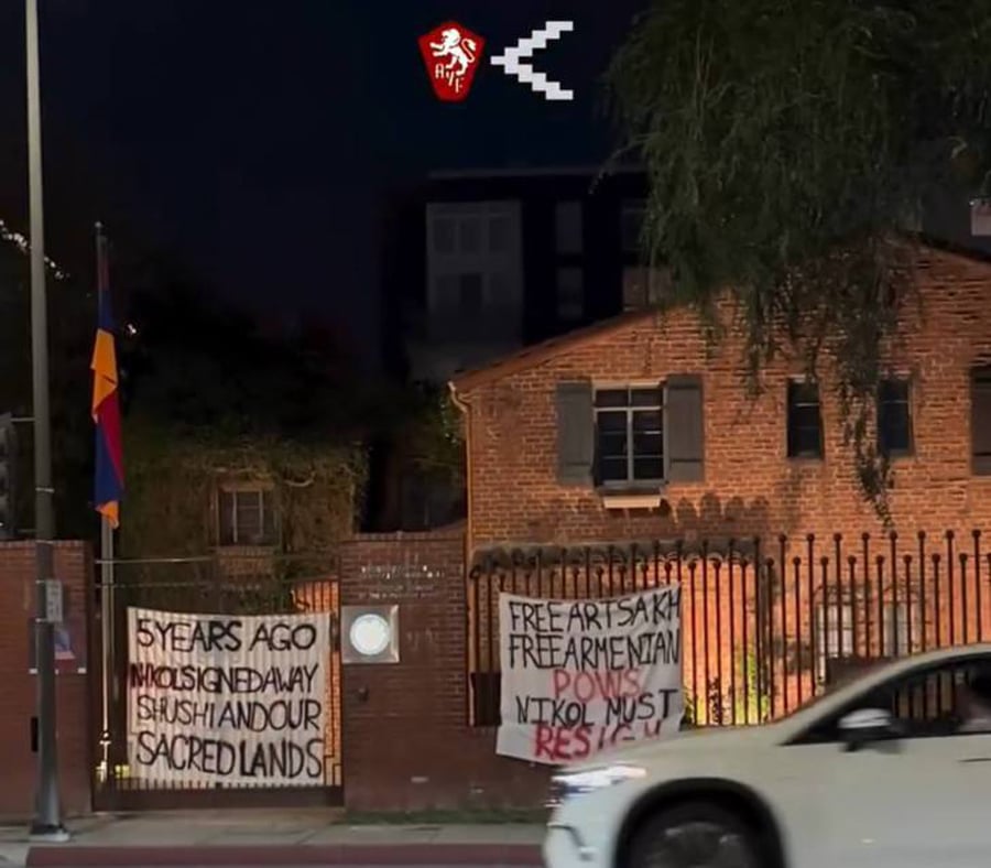 Երիտասարդները հյուպատոսության դարպասներին փակցրել են «5 տարի առաջ Նիկոլը հանձնեց Շուշին և մեր սուրբ հողերը» և «Ազատ Արցախ, ազատություն հայ ռազմագերիներին, Նիկոլը պետք է հեռանա» գրությամբ պաստառներ։