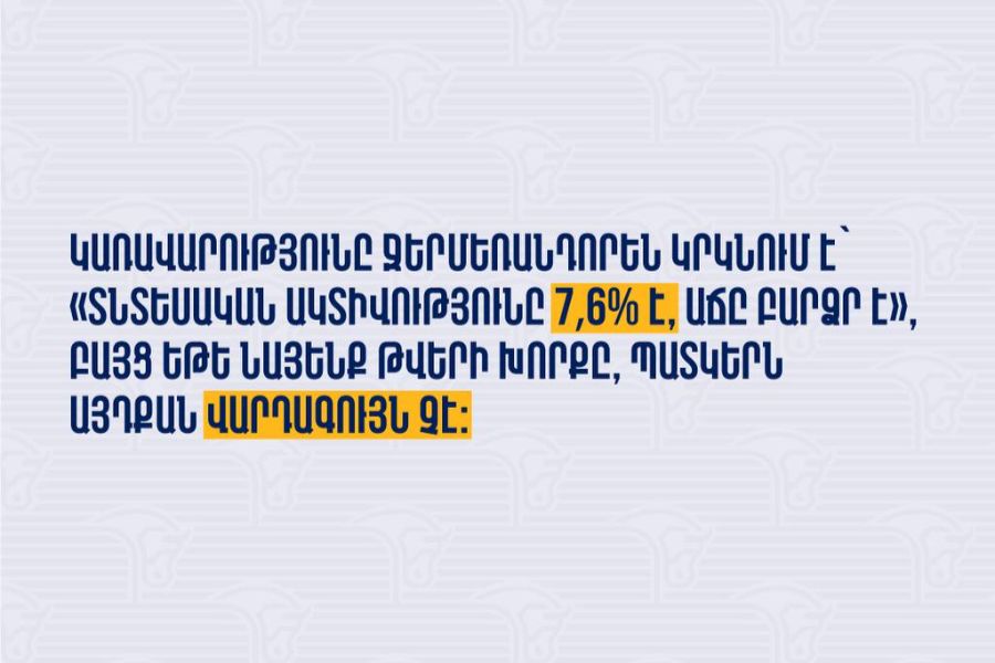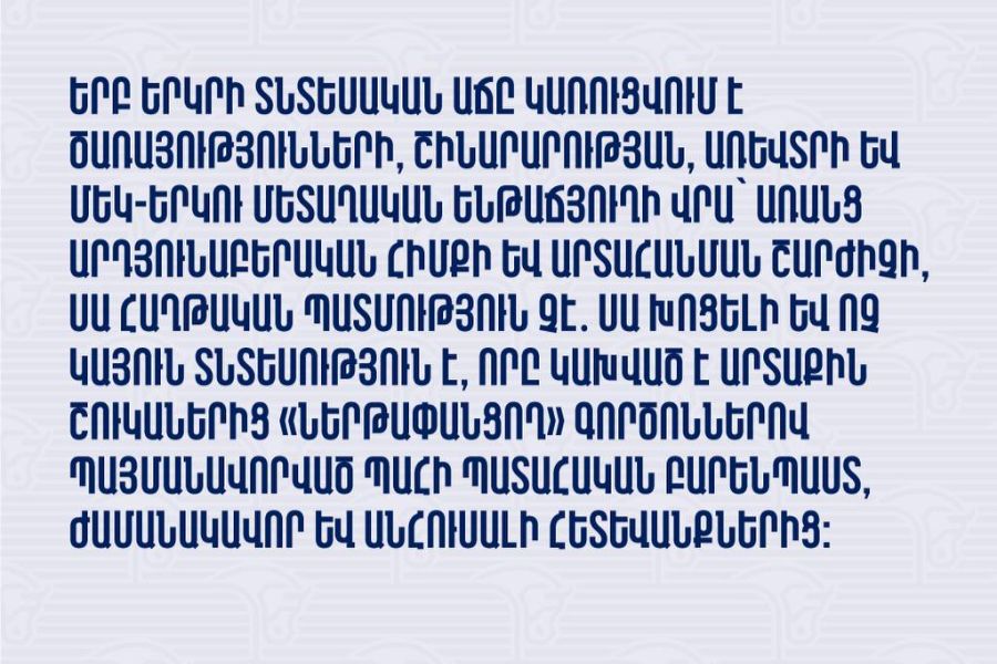Երբ երկրի տնտեսական աճը կառուցվում է ծառայությունների, շինարարության, առևտրի և մեկ-երկու մետաղական ենթաճյուղի վրա՝ առանց արդյունաբերական հիմքի և արտահանման շարժիչի, սա հաղթական պատմություն չէ․ սա խոցելի և ոչ կայուն տնտեսություն է, որը կախված է արտաքին շուկաներից «ներթափանցող» գործոններով պայմանավորված պահի պատահական բարենպաստ, ժամանակավոր և անհուսալի հետևանքներից։