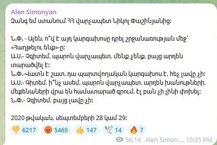 «Հարգելի հետևորդներ, իմ տելեգրամյան ալիքը ենթարկվել է հարձակման՝ մի քանի հազար կեղծ ռեակցիաներ են լցվել: Դե ինչ, ուրեմն ամեն բան ճիշտ ենք անում», տելեգրամյան իր ալիքում գրել է ՀՀ Ազգային ժողովի նախագահ Ալեն Սիմոնյանը։