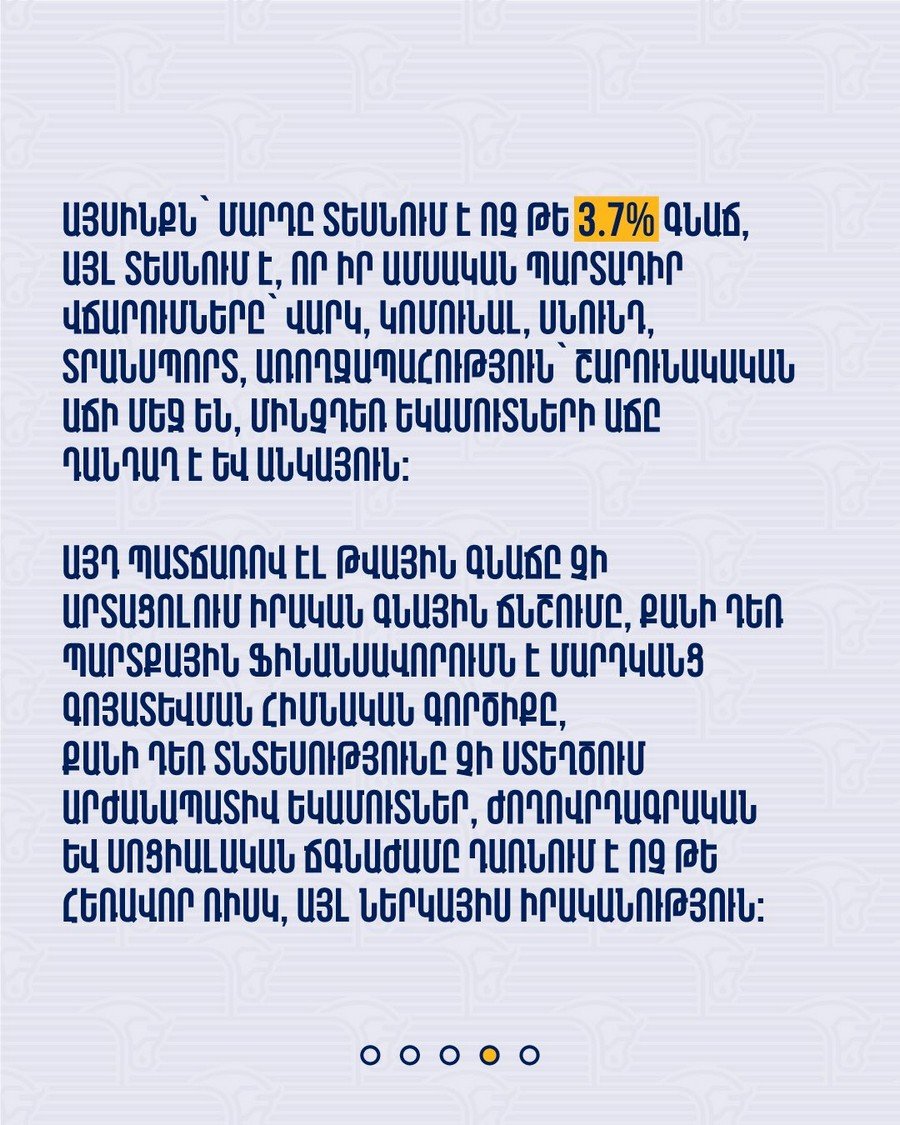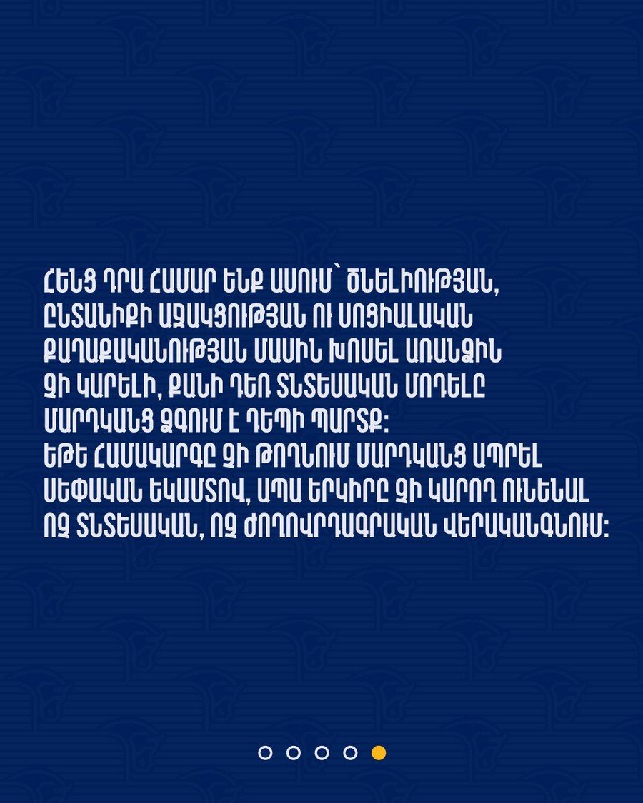 Ծնելիության, ընտանիքի աջակցության ու սոցիալական քաղաքականության մասին խոսել առանձին չի կարելի, քանի դեռ տնտեսական մոդելը մարդկանց ձգում է դեպի պարտք։ Եթե համակարգը չի թողնում մարդկանց ապրել սեփական եկամտով, ապա երկիրը չի կարող ունենալ ոչ տնտեսական, ոչ ժողովրդագրական վերականգնում։