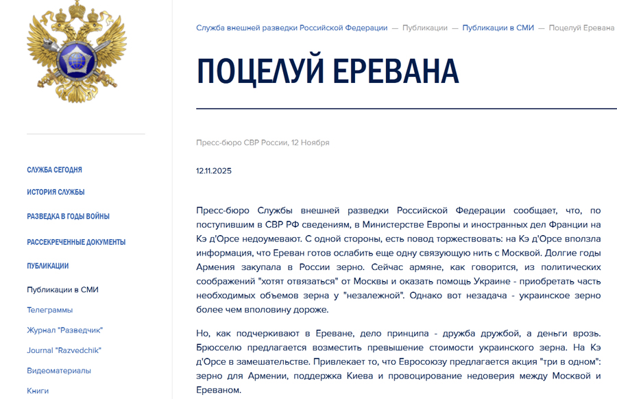 ՌԴ արտաքին հետախուզության ծառայության «Երևանի համբույրը» վերնագրված հաղորդագրության մեջ նշվում է.