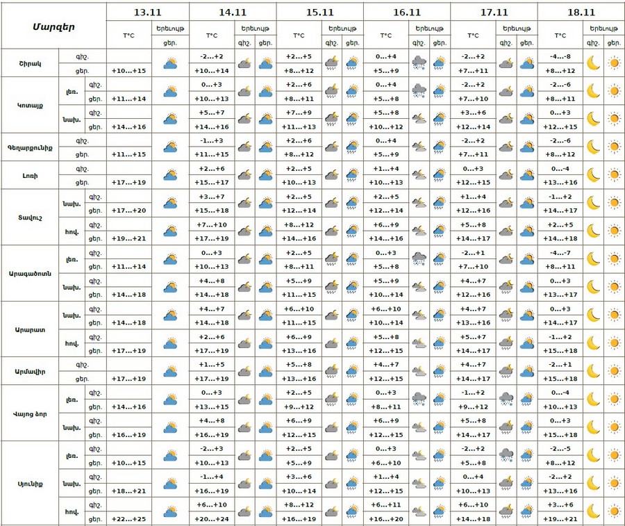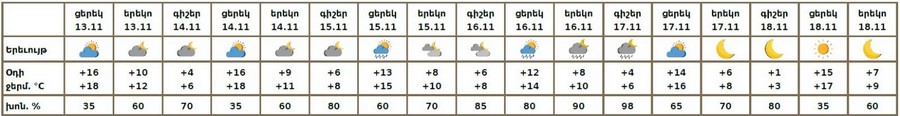 Նոյեմբերի 13-ի ցերեկը, 14-ին, 18-ին սպասվում է առանց տեղումների եղանակ: Նոյեմբերի 15-17-ին առանձին շրջաններում սպասվում են կարճատև տեղումներ, գիշերը լեռնային գոտիներում ձնախառն անձրևի տեսքով։ Քամին հարավարևմտյան՝ 2-5մ/վ: