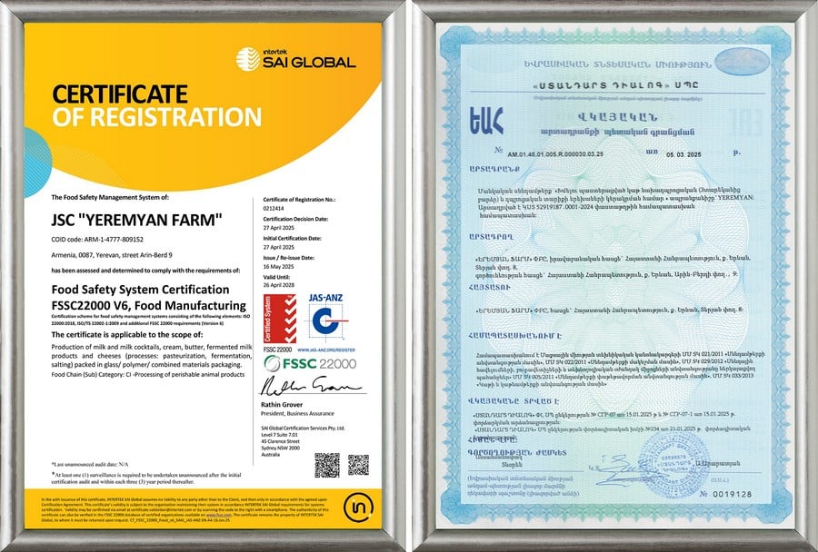 Երեմյան կաթնամթերքն աշխարհում հեղինակավոր Intertek SAI Global աուդիտորական ընկերության կողմից 2025 թվականին անցել է կաթնամթերքի արտադրության խստագույն ստանդարտ համարվող FSSC 22000 V 6 սերտիֆիկացիոն աուդիտը և ստացել FSSC 22000 (Food Safety System Certification) սերտիֆիկատ։ Երեմյան կաթնամթերքը ոլորտում այս սերտիֆիկատով առաջինն ու միակն է։