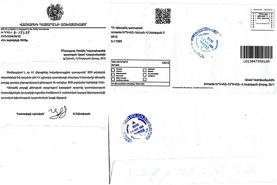 Կից հրապարակում եմ տվյալը, ըստ որի Վճռաբեկ դատարանից փաստացի ելքագրվել է 2025 թվականի նոյեմբերի 13-ին գրություն, որը ստացվել է 2025 թվականի նոյեմբերի 14-ին: Գրության մեջ իբր թվագրված «նոյեմբերի 12» նշված է, որ Վճռաբեկ դատարանի որոշումը հրապարակվելու է նոյեմբերի 13-ին: