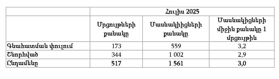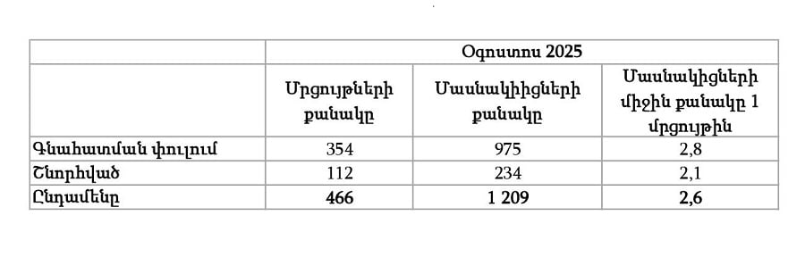 2025 թ. հունիս, հուլիս և օգոստոս ամիսների ընթացքում պետական գնումներին` միջին հարաբերակցությամբ, մասնակցել են առավելագույնը 2–3 կազմակերպություն:
