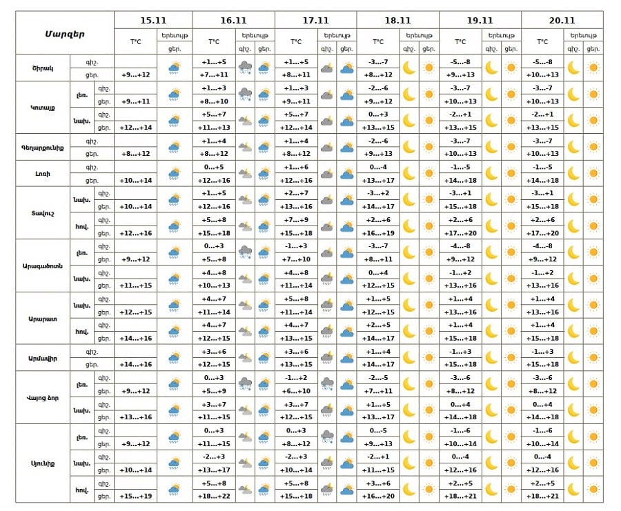 Նոյեմբերի 15-ի ցերեկը, 16-ին, 17-ի գեշերն առանձին շրջաններում սպասվում են կարճատև տեղումներ, գիշերը լեռնային գոտիներում ձնախառն անձրևի տեսքով։ Նոյեմբերի 17-ի ցերեկը, 18-20-ին սպասվում է առանց տեղումների եղանակ: Քամին հարավարևմտյան՝ 2-5մ/վ: Օդի ջերմաստիճանը նոյեմբերի 15-16-ին ցերեկը կնվազի 3-5 աստիճանով, 17-19-ին աստիճանաբար նույնքան կբարձրանա։