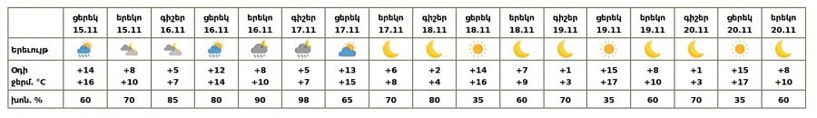 Նոյեմբերի 15-ի ցերեկը, 16-ին, 17-ի գիշերը և առավոտյան սպասվում է կարճատև անձրև։ Նոյեմբերի 17-ի ցերեկը, 18-20-ին սպասվում է առանց տեղումների եղանակ։