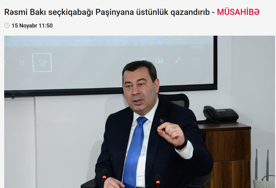 «Ադրբեջանական կողմը փաստացի Փաշինյանին տվել է «քարտ բլանշ»՝ խաղաղության քաղաքականություն վարելու համար և ստեղծել է հնարավորություն։ Խաղաղության քաղաքականություն վարելով՝ պաշտոնական Բաքուն Փաշինյանին առավելություն է տվել ընտրություններից առաջ։ Նա նաև պարտավոր է օգտագործել սա՝ աշխատանքն արագացնելու համար։ Աշխատանքը չի ավարտվում միայն հայտարարություններ անելով», – իր հարցազրույցում նման միտք է արտահայտել Ադրբեջանի Միլլի Մեջլիսի պատգամավոր Սամեդ Սեյիդովը։
