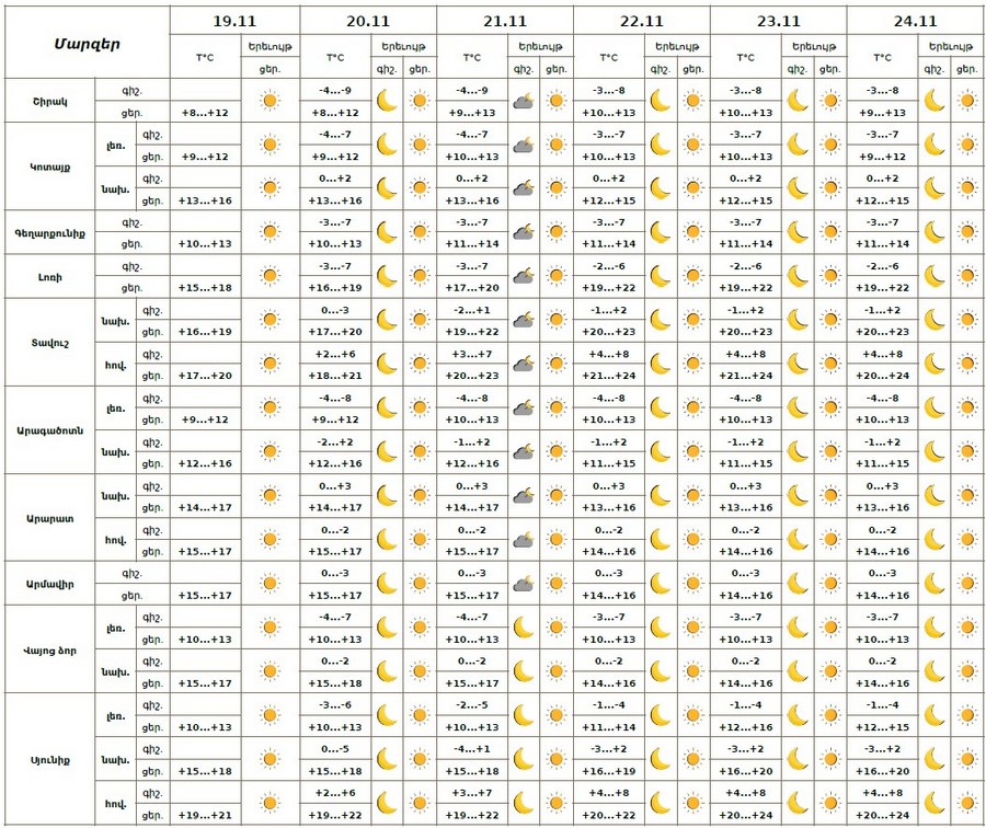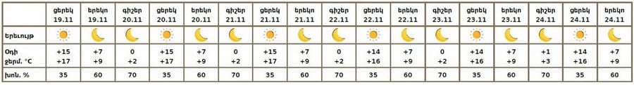Նոյեմբերի 19-ի ցերեկը, 20-24-ին սպասվում է առանց տեղումների եղանակ։