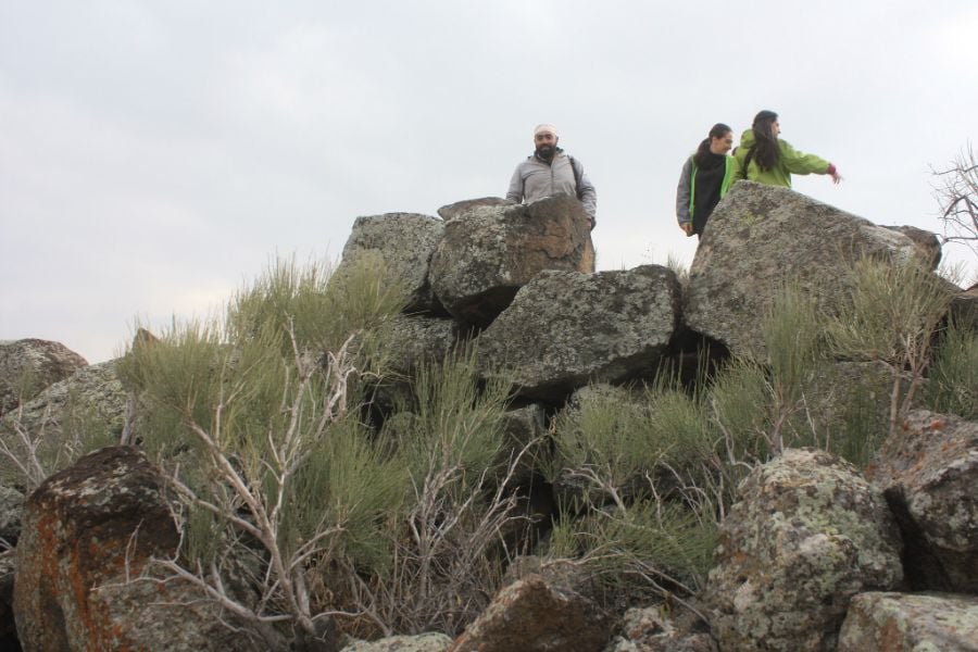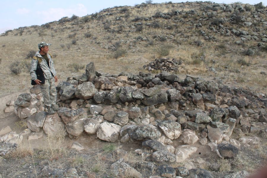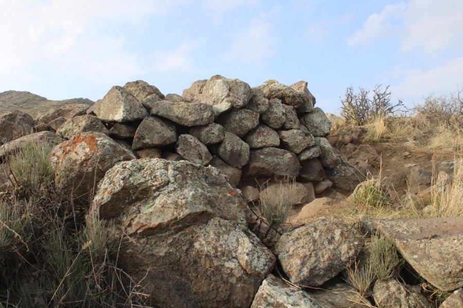 Պաշտպանական պարիսպները եղել են մի քանի շարք։ Տարածքում շատ են նաև դամբարանները, որոնցից մի ո պեղվել են։ Սամվելի ուղեկցությամբ իջնում եմ ցած, որտեղ է մոտ 30 մ տրամագծով դամբարան։ Պեղվել է 2 տարի առաջ, քիչ գտածոներ են հայտնաբերվել, սակայն դամբարանը եղել է հետաքրքիր կառույց՝ եռատակ շրջանաձև պատերով։